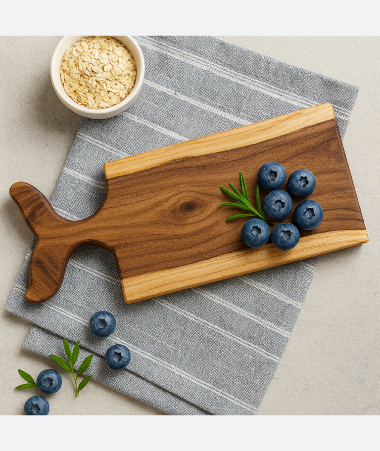 La teca aporta estabilidad, resistencia y una sensación cálida al tacto. Gracias a sus aceites naturales, esta tabla se comporta muy bien frente al uso diario y la humedad ocasional, manteniendo su forma y belleza con el paso del tiempo.